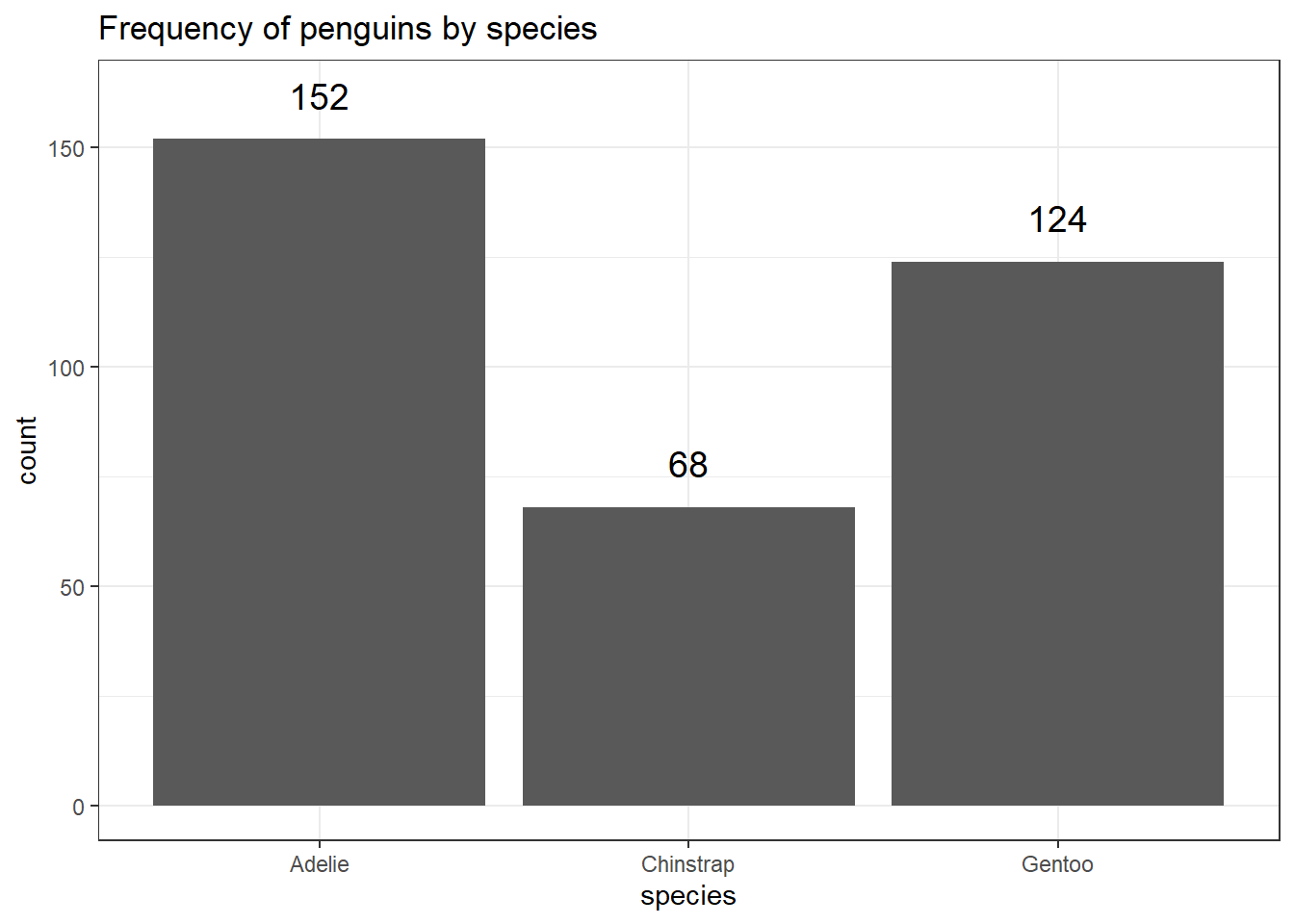 There are 152 Adelie penguins, 68 Chinstrap penguins, and 124 Gentoo penguins in this dataset.