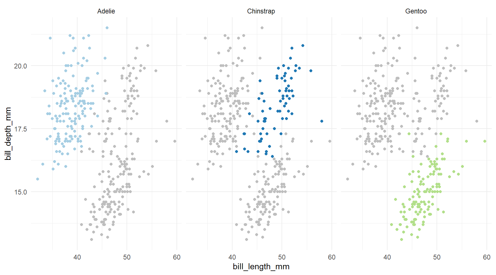 d <- ggplot(pen, aes(x=bill_length_mm, y=bill_depth_mm, color=species)) + geom_point() +