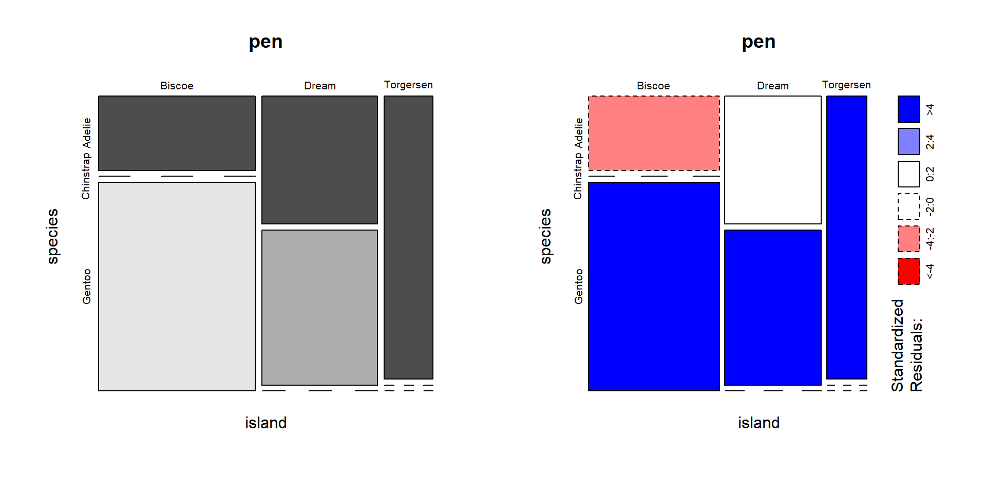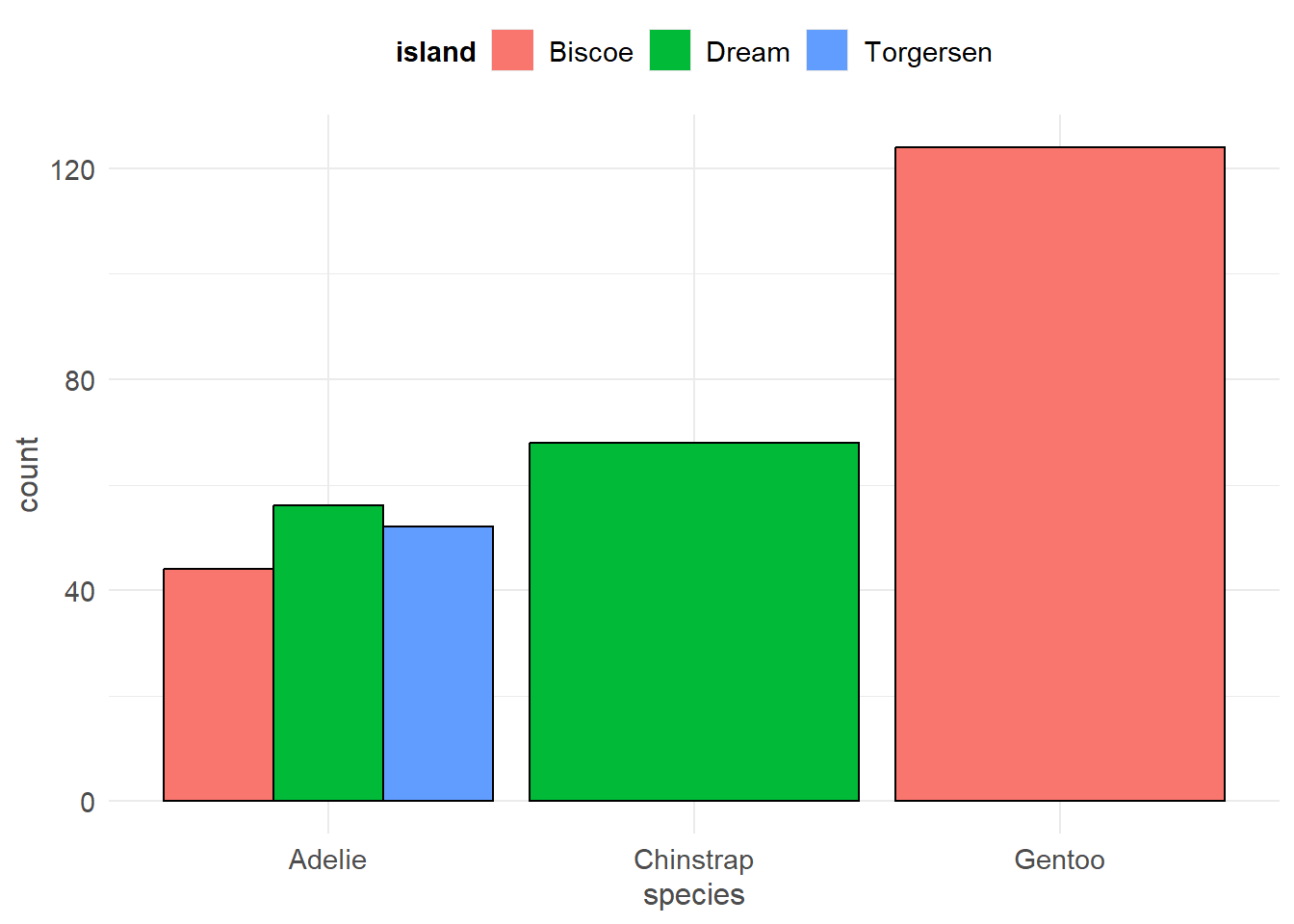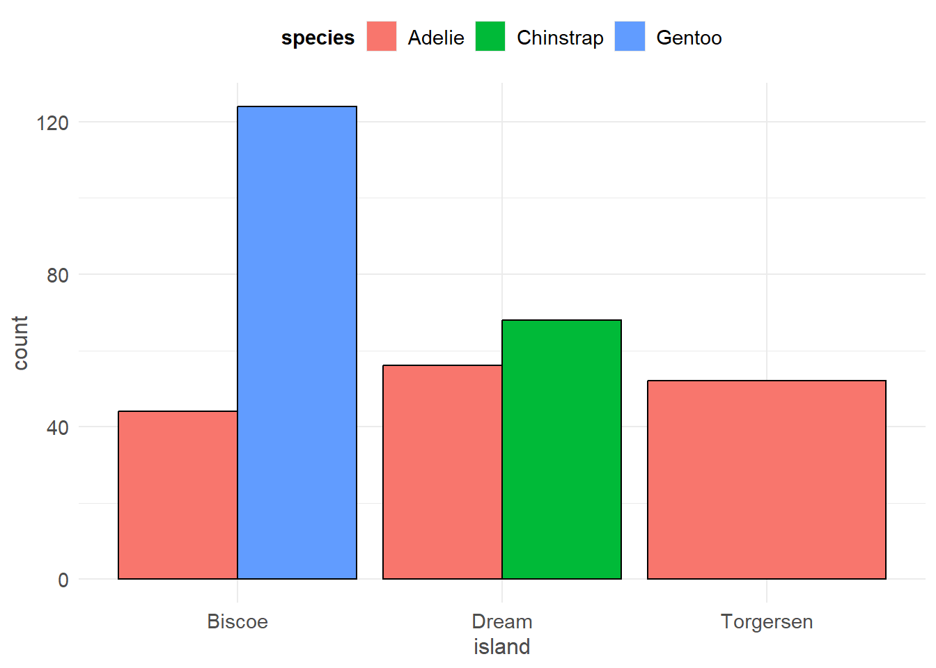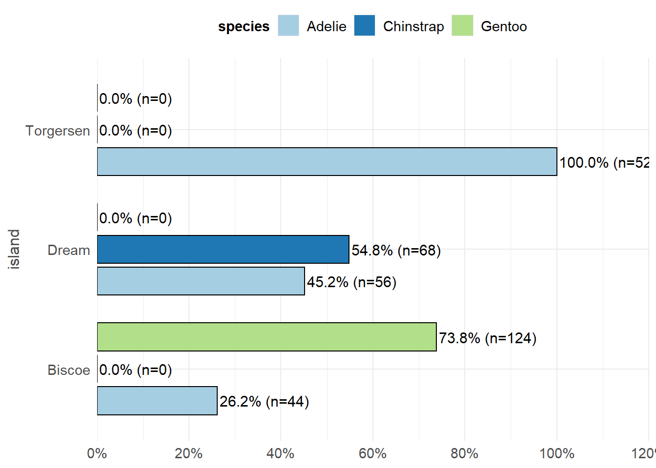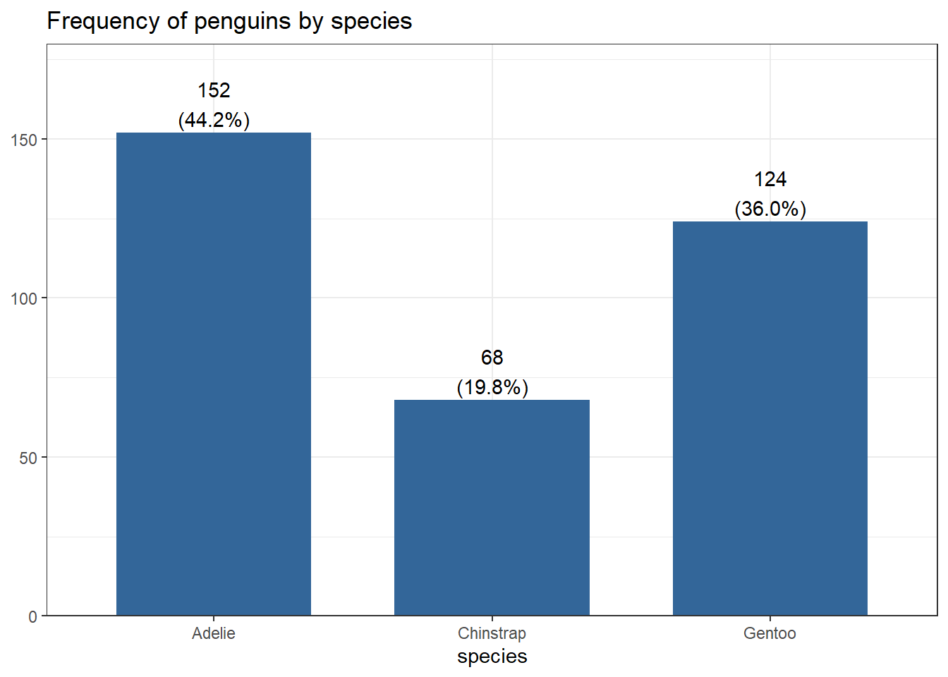 This is the same barchart generated by the frequency example; note the proportion shown as a percentage below each species’ count. sjPlot will automatically do this for you - another reason why it’s the preferred package!
