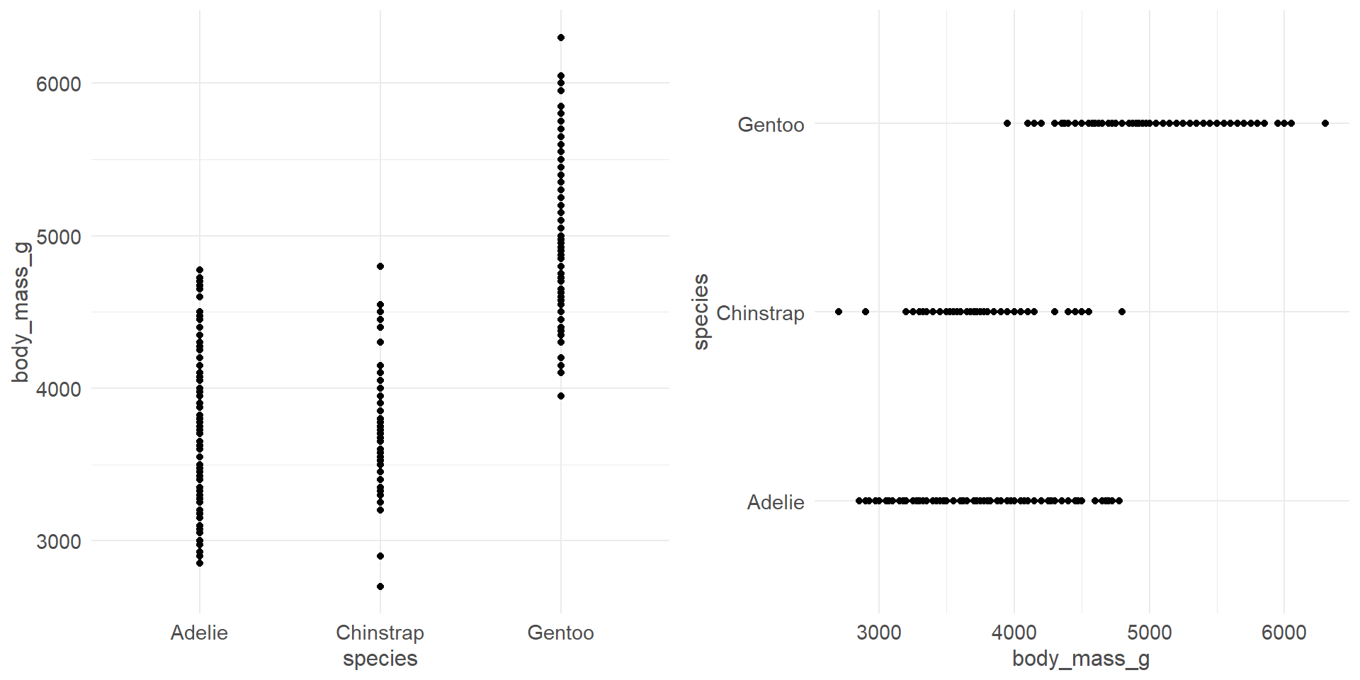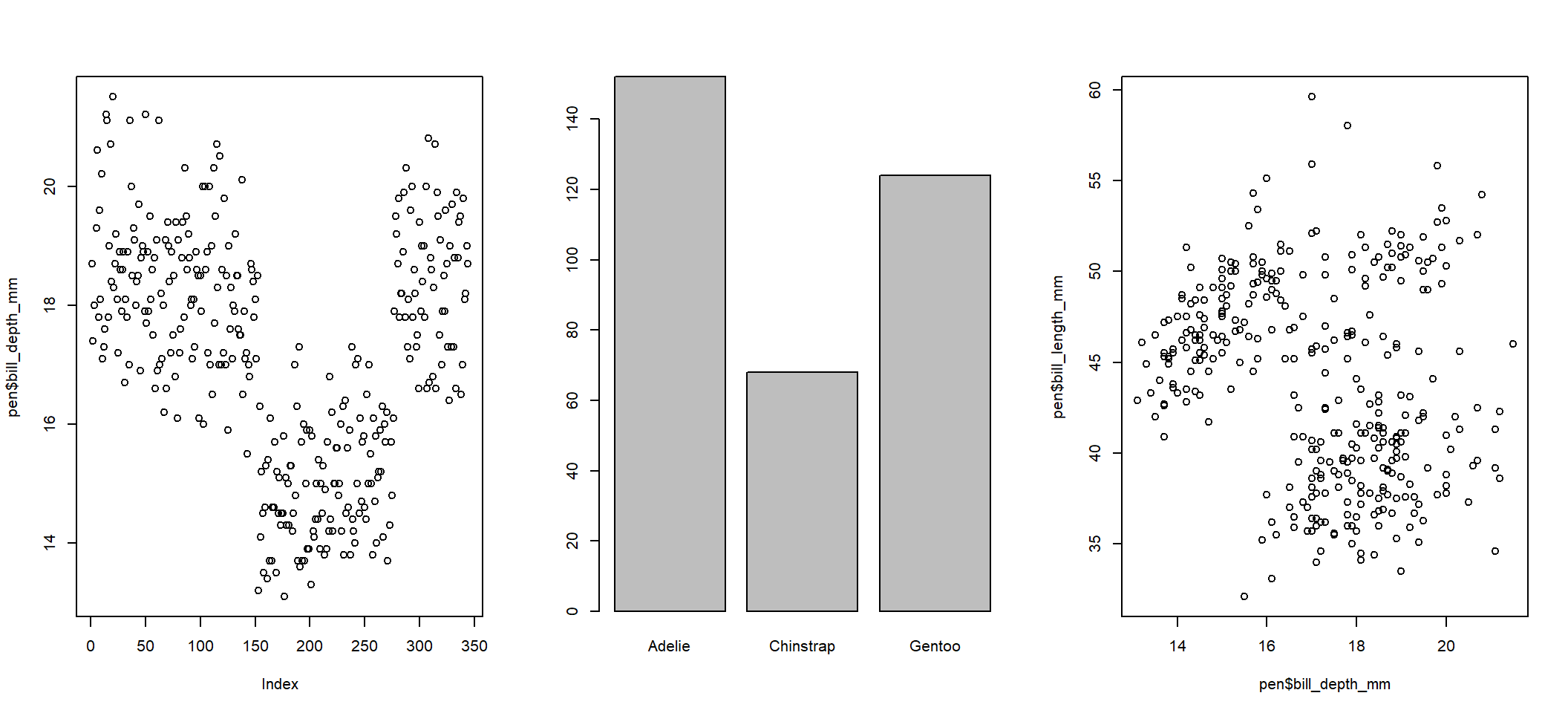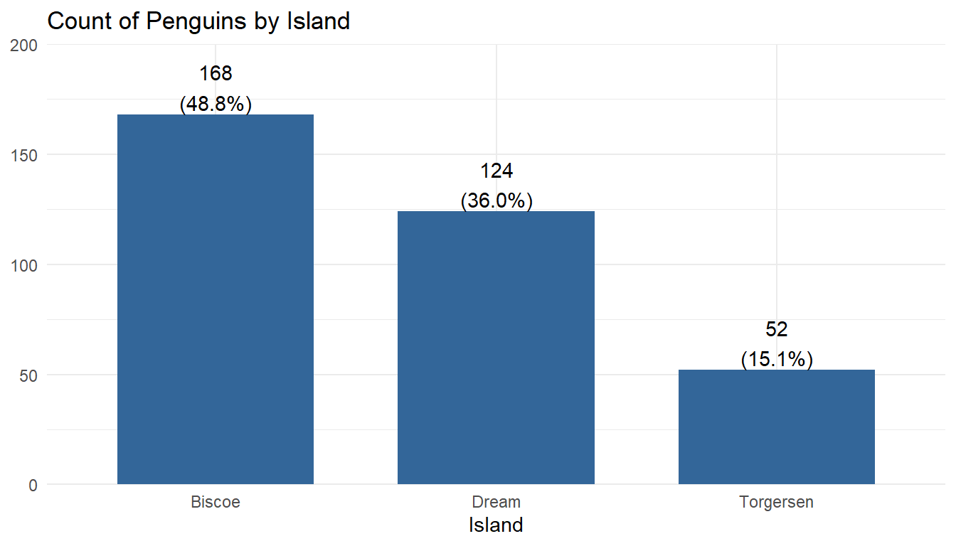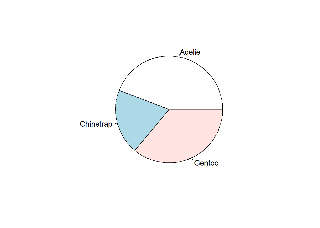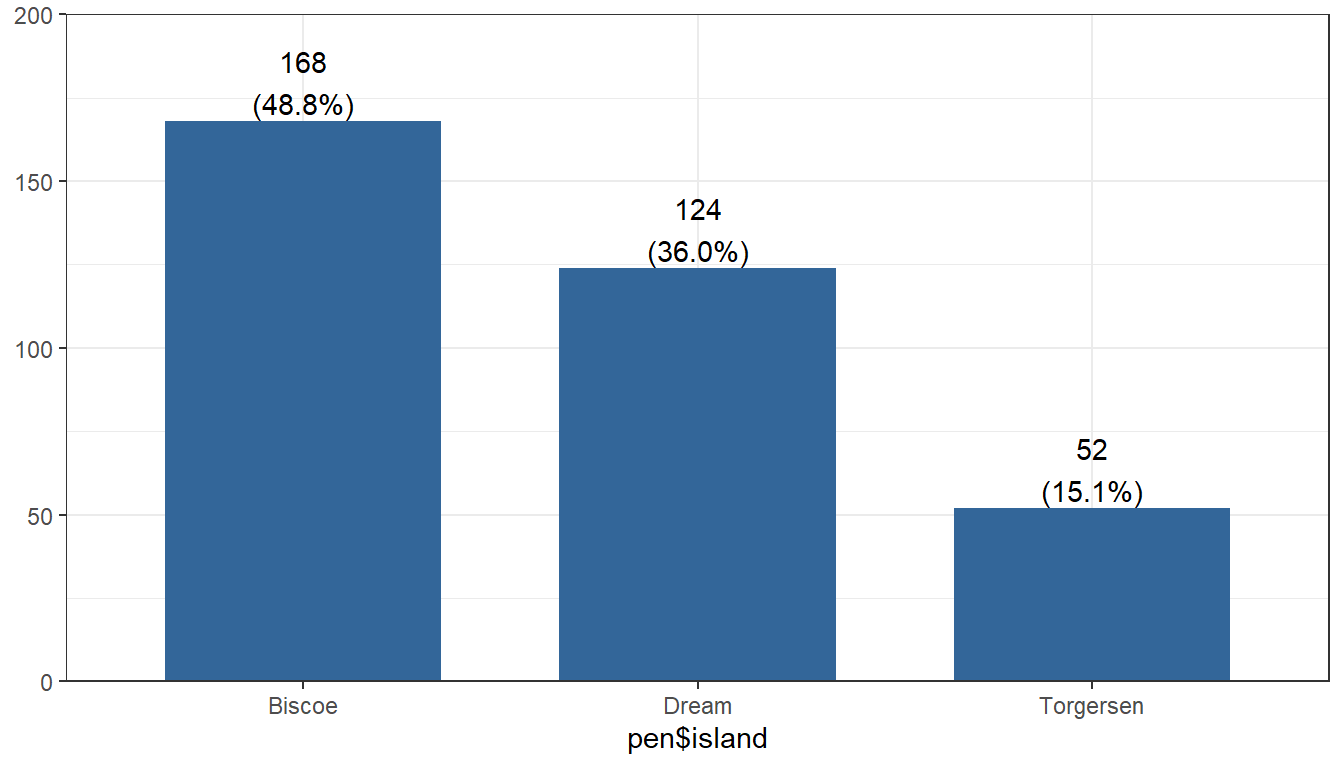 pen <- palmerpenguins::penguinsThe following sections show examples of data visualizations by variable type (categorical, continuous, or both) and number of variables. These visualizations have been created in base R and at least one other R package to demonstrate different ways of creating similar visualizations and demonstrate key package features.