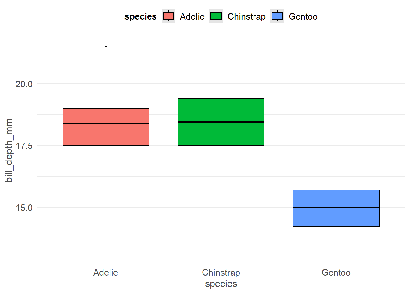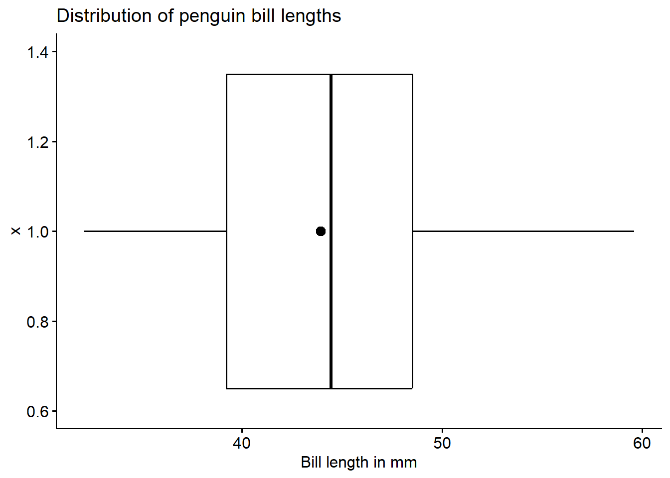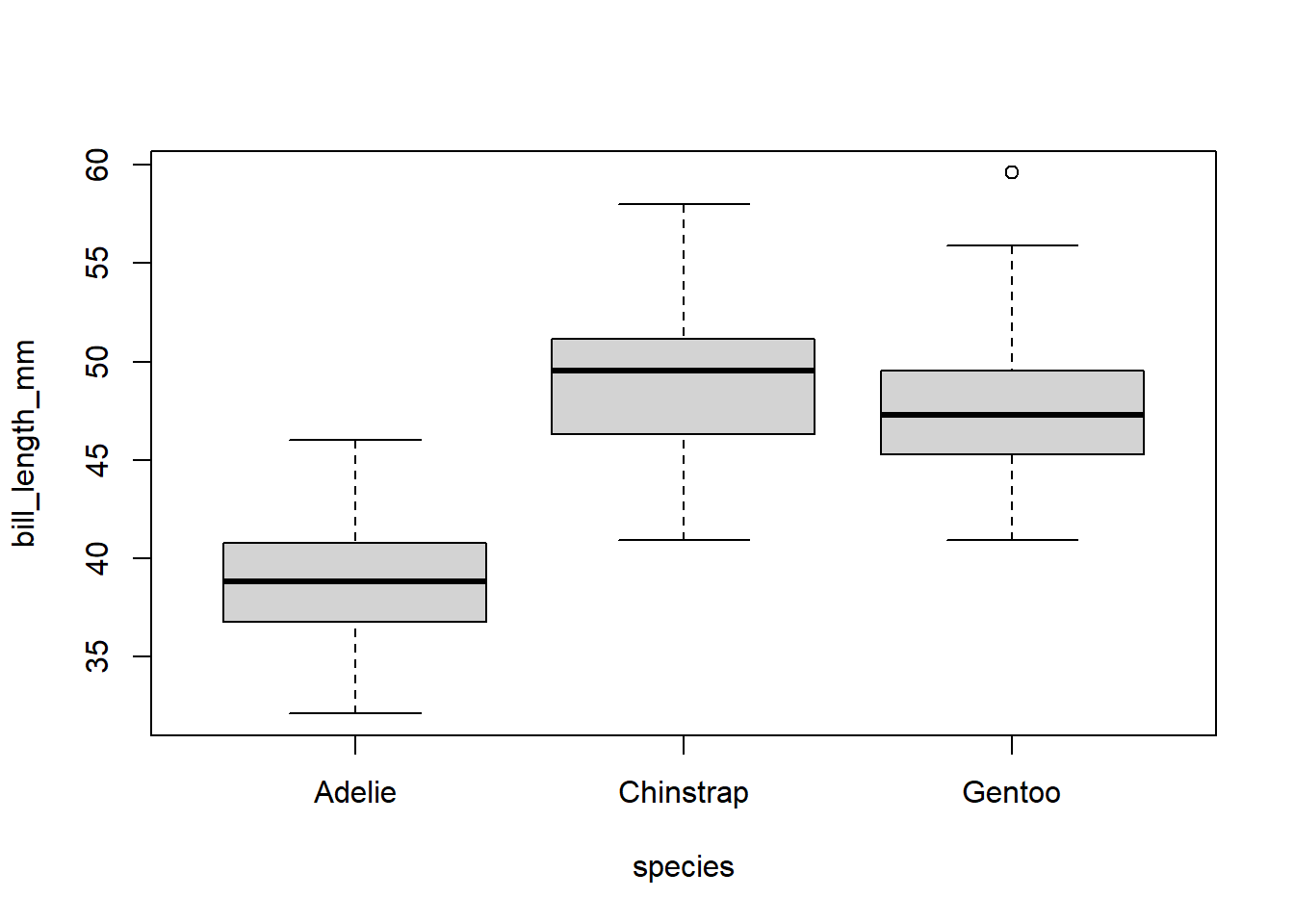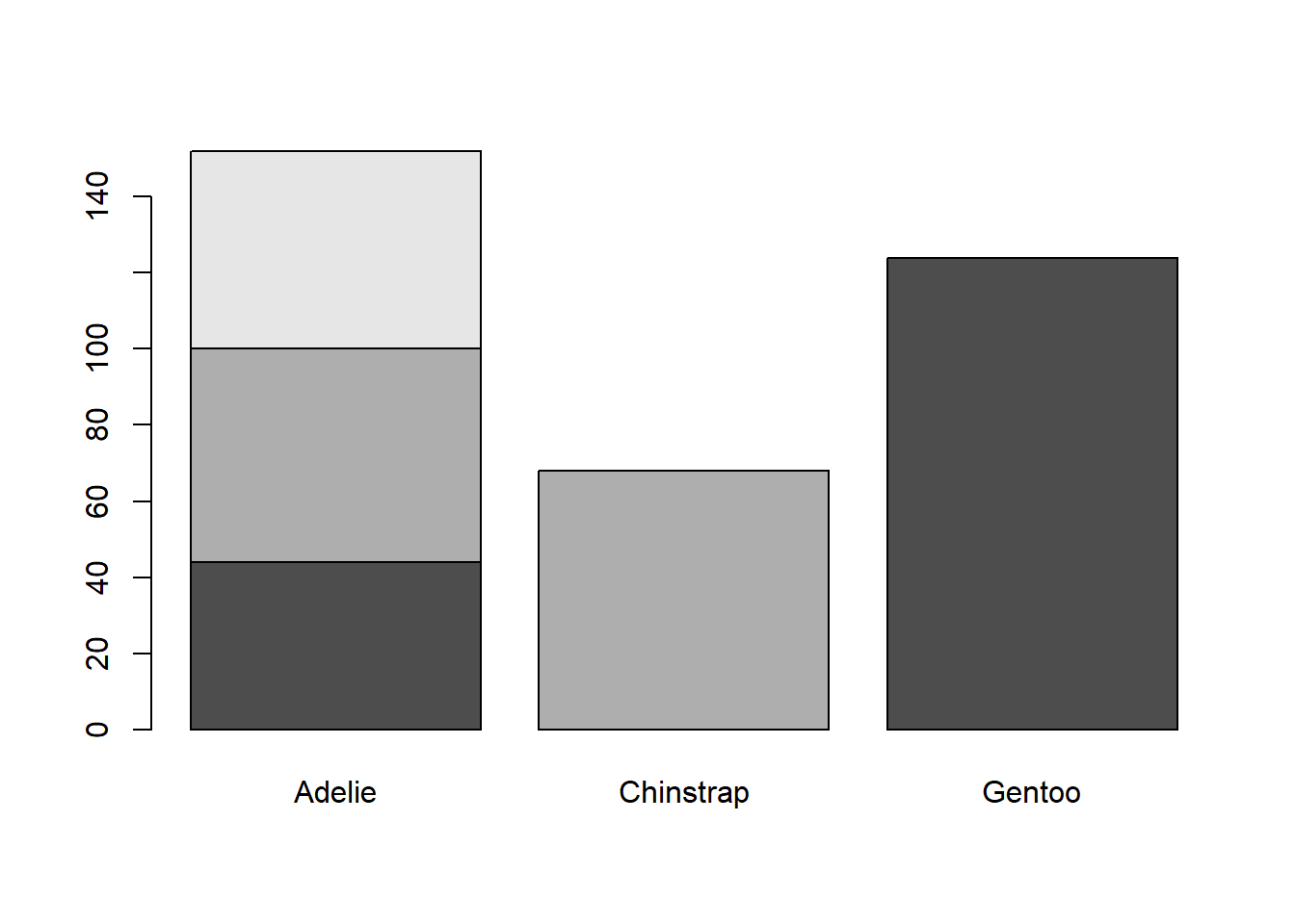 pen <- palmerpenguins::penguinsThe following sections show examples of data visualizations by variable type (categorical, continuous, or both) and number of variables. These visualizations have been created in base R and at least one other R package to demonstrate different ways of creating similar visualizations and demonstrate key package features.