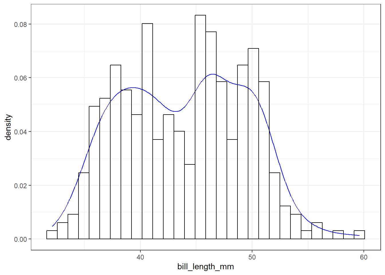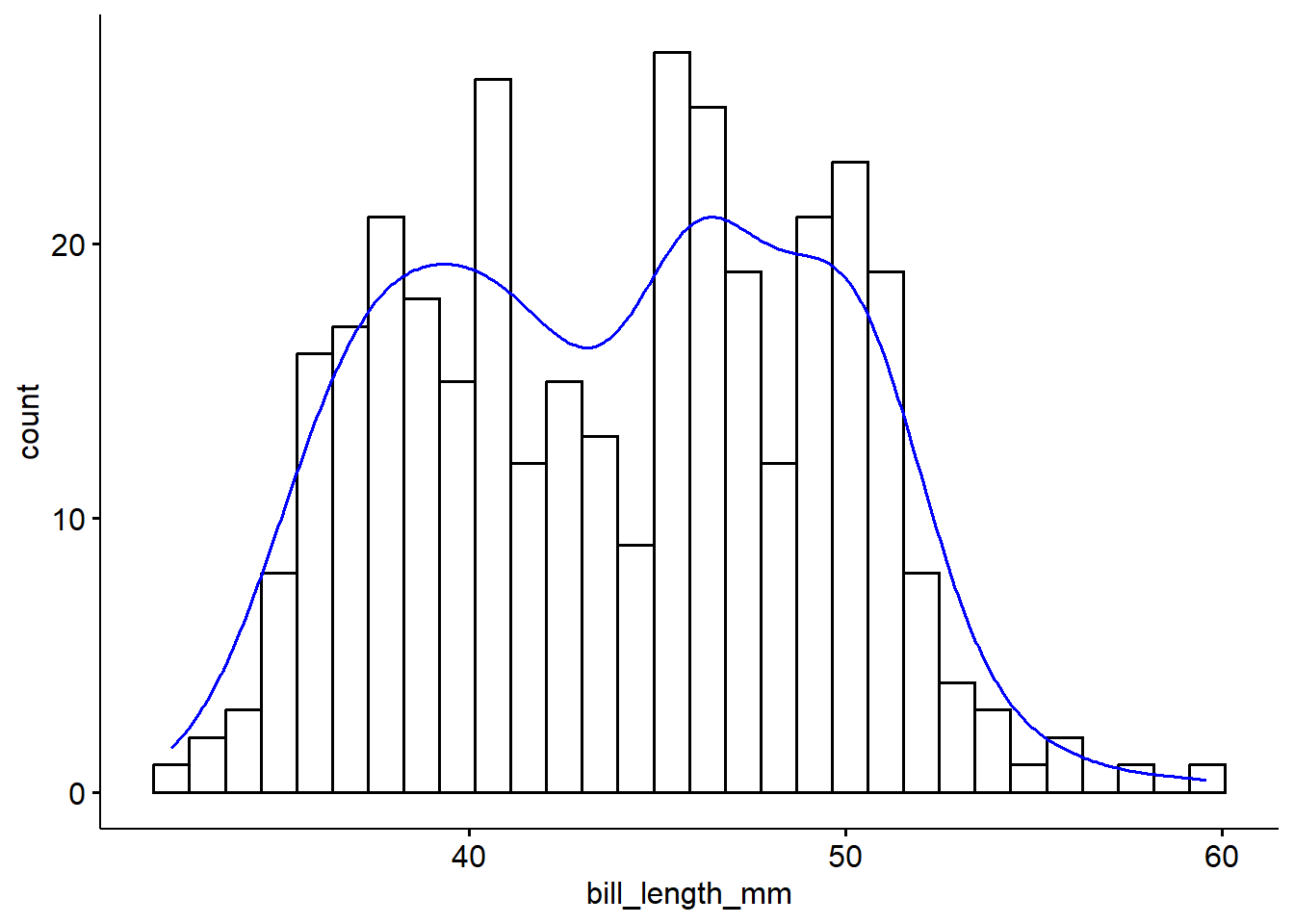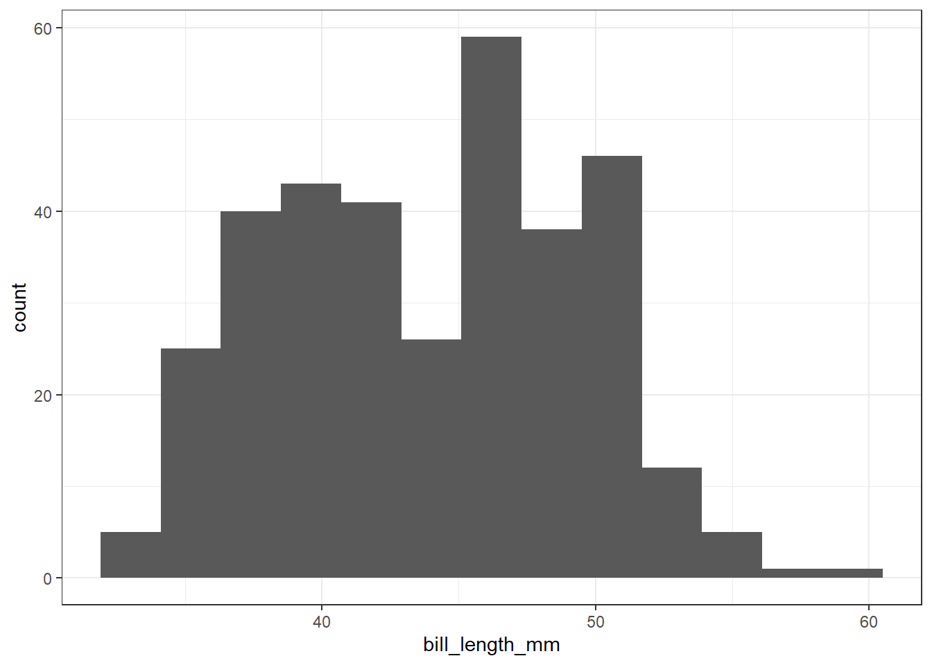 ggplot(pen, aes(x=bill_length_mm)) + geom_histogram(binwidth = 2.2)
