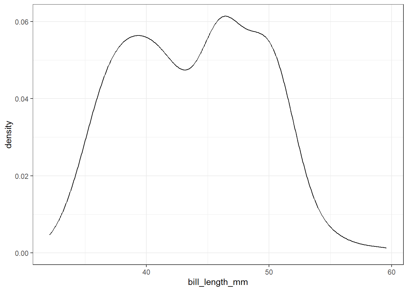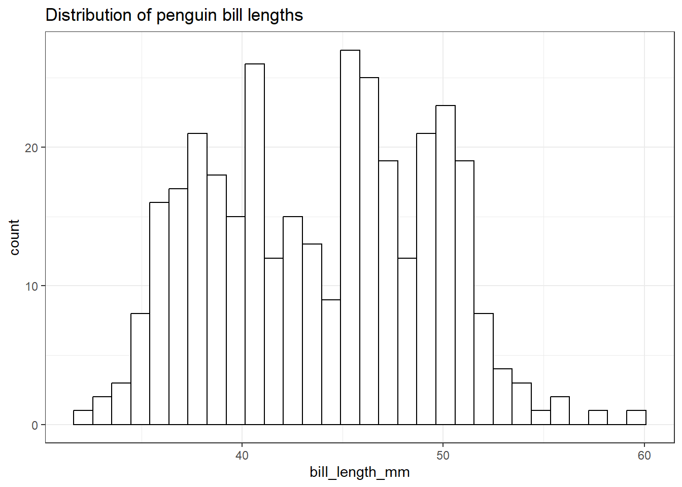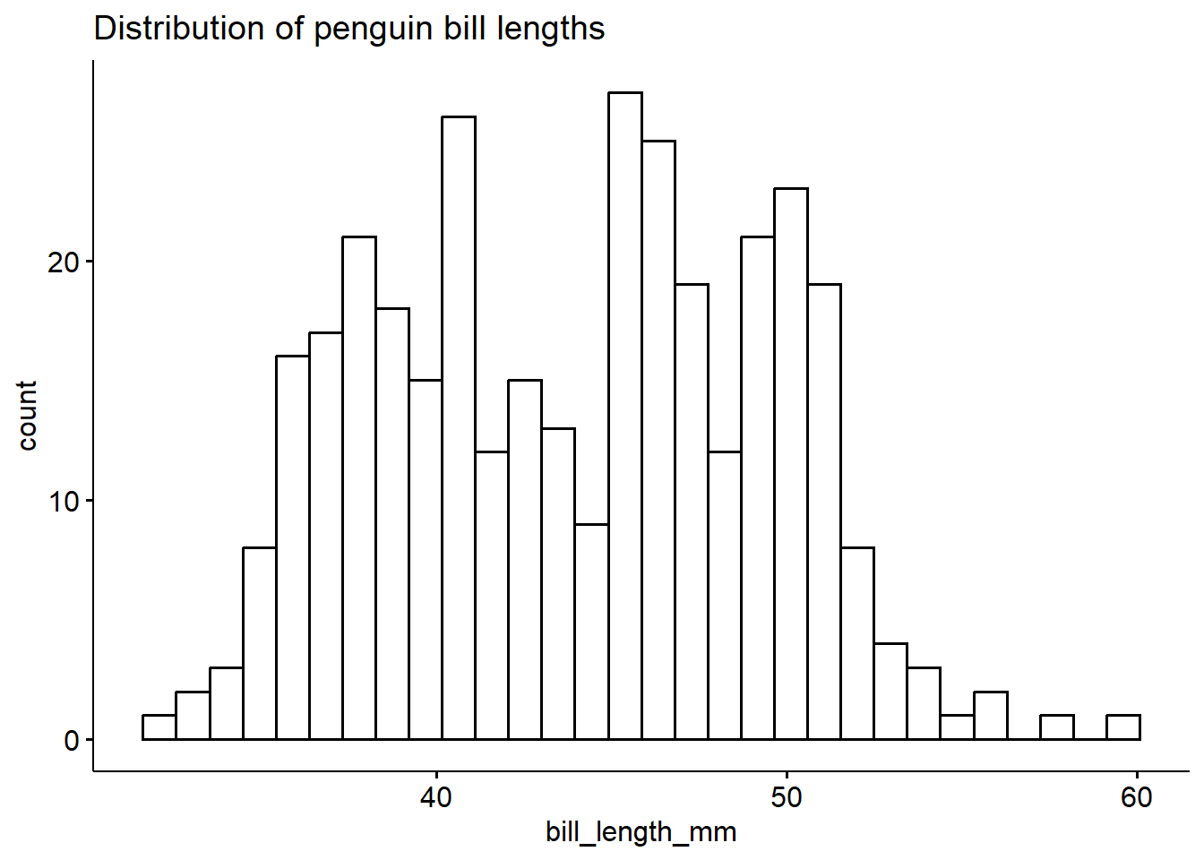 ggplot(pen, aes(x=bill_length_mm)) + geom_histogram(colour="black", fill="white") +