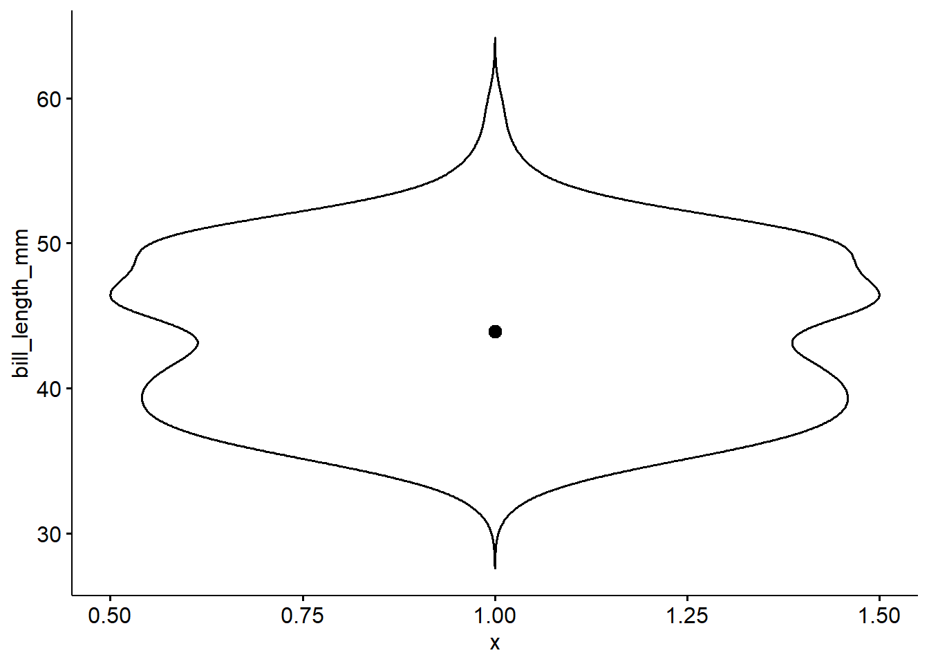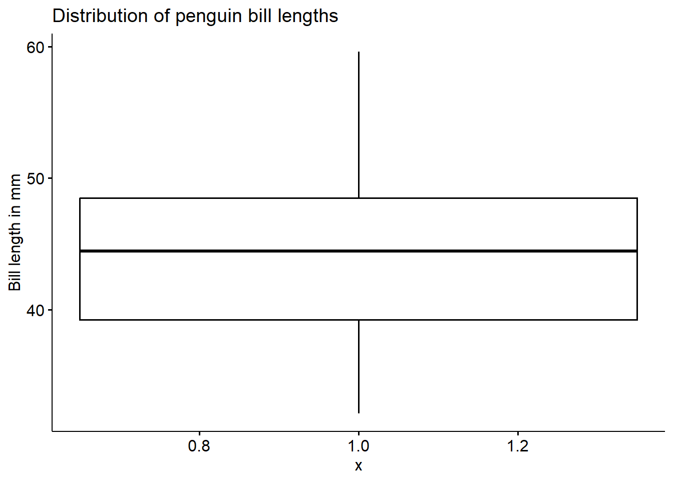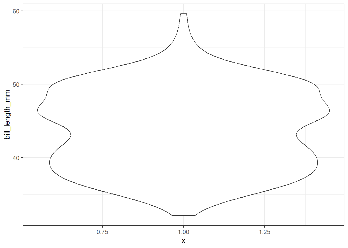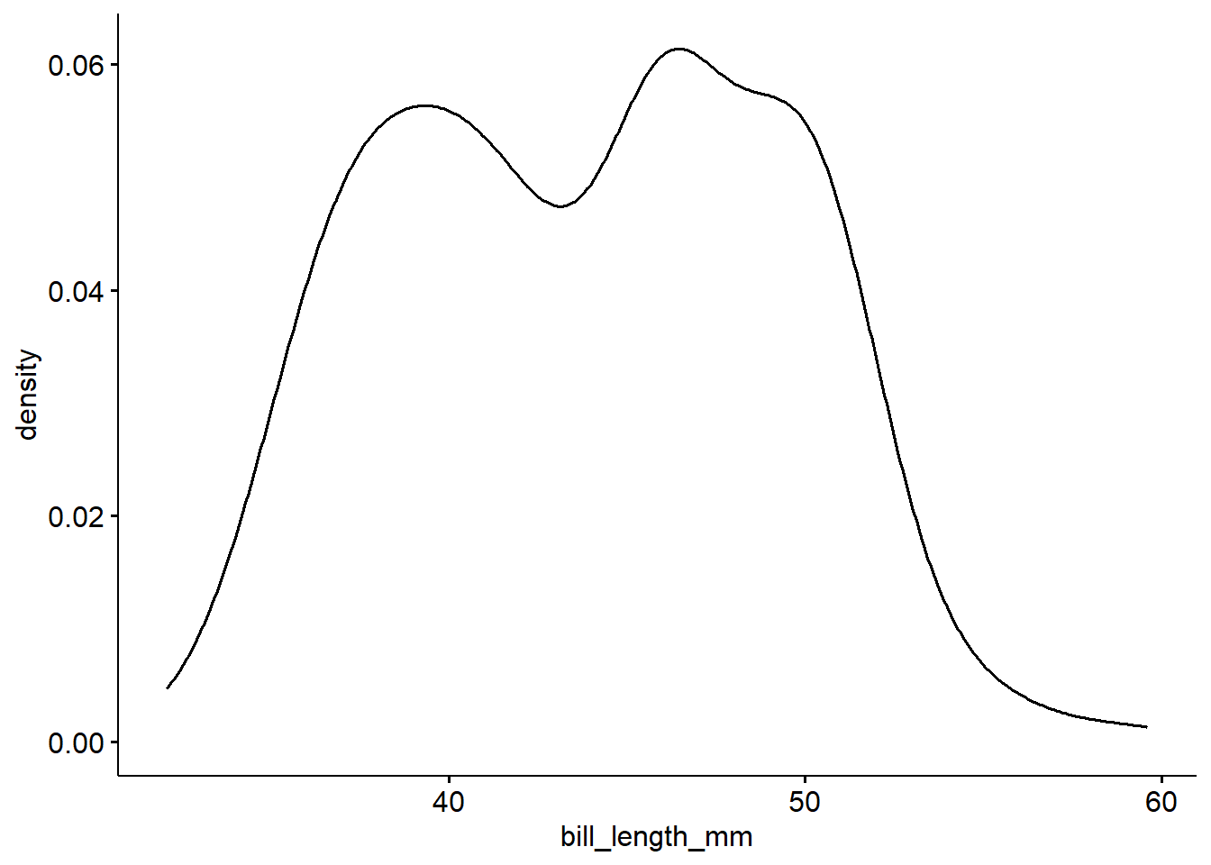 ggplot(pen, aes(x=bill_length_mm)) + geom_histogram(colour="black", fill="white") +