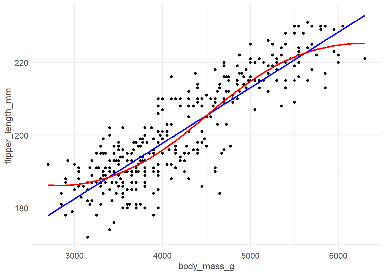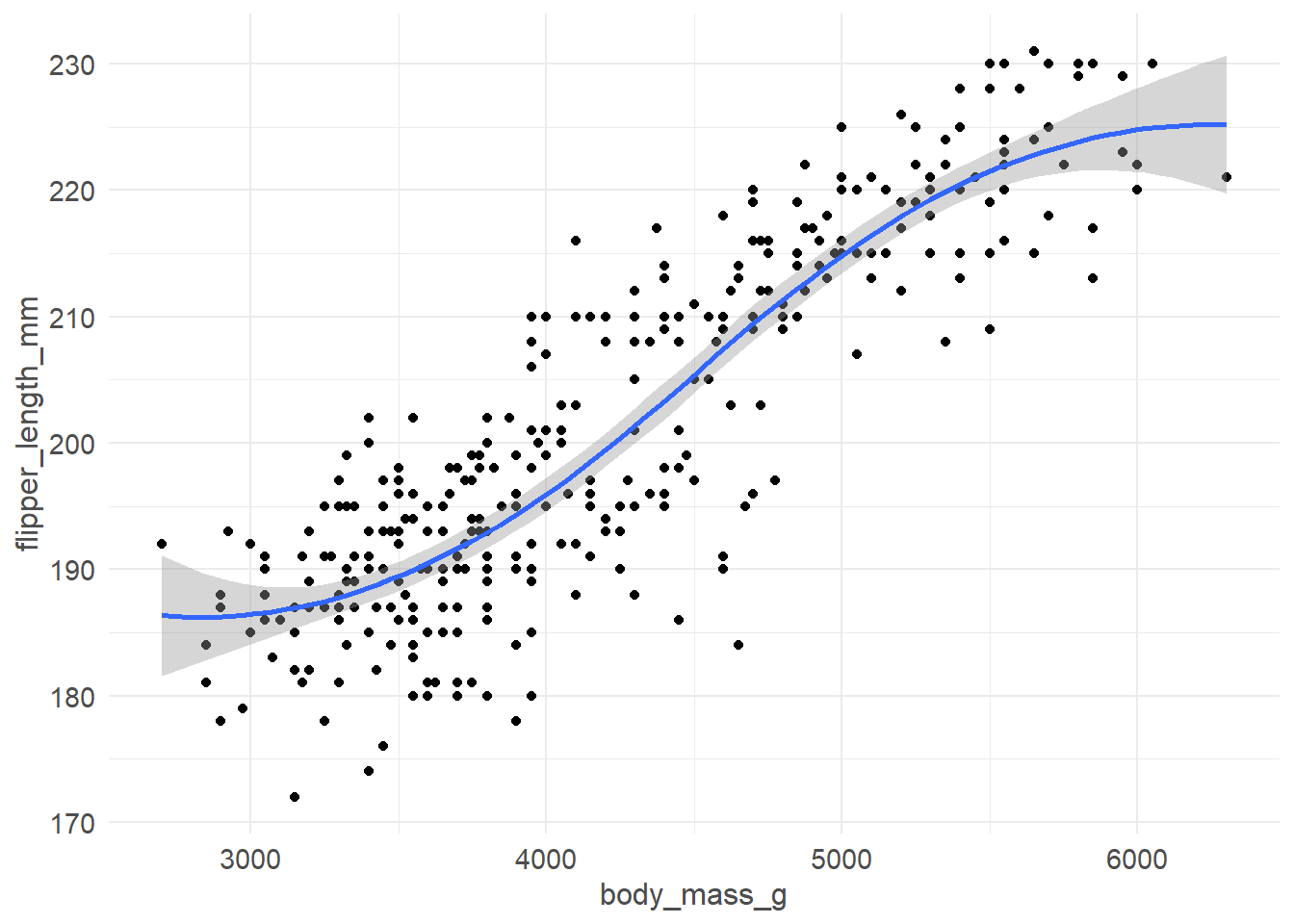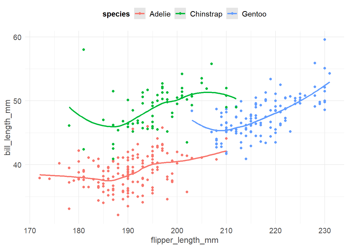 ggplot(pen, aes(x=flipper_length_mm, y=bill_length_mm, color=species)) + geom_point() + geom_smooth(se=FALSE)