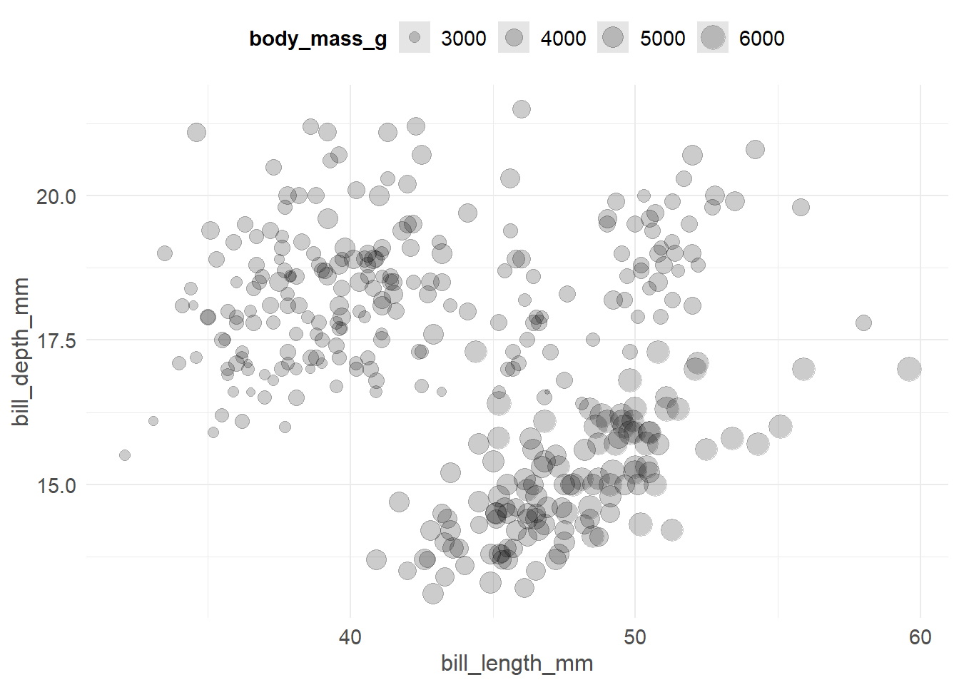 ggplot(pen, aes(x=bill_length_mm, y=bill_depth_mm, size=body_mass_g)) + geom_point(alpha=.2)