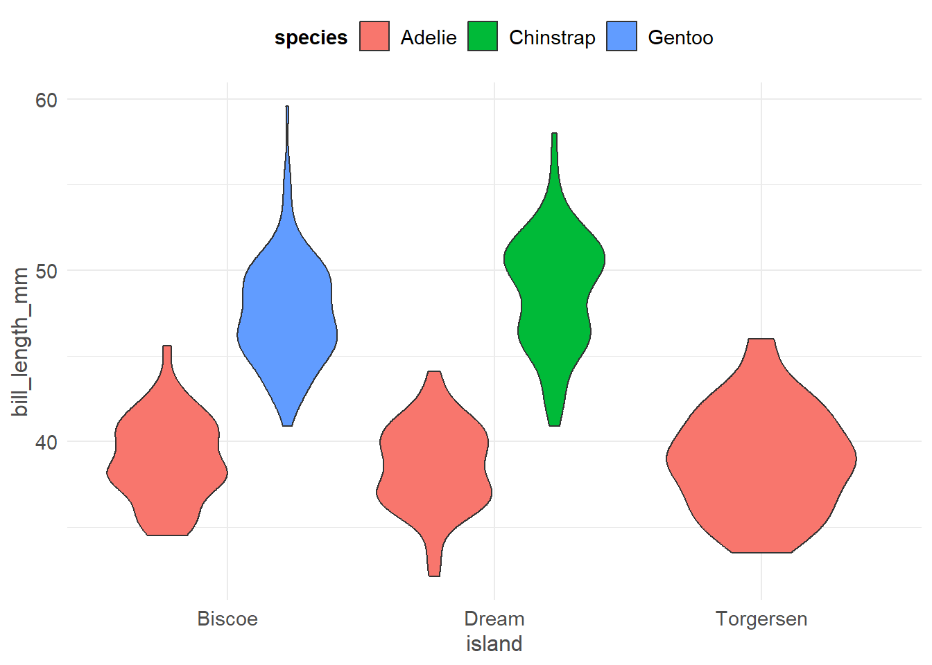 ggplot(pen, aes(x=island, y=bill_length_mm, fill=species)) + geom_violin()