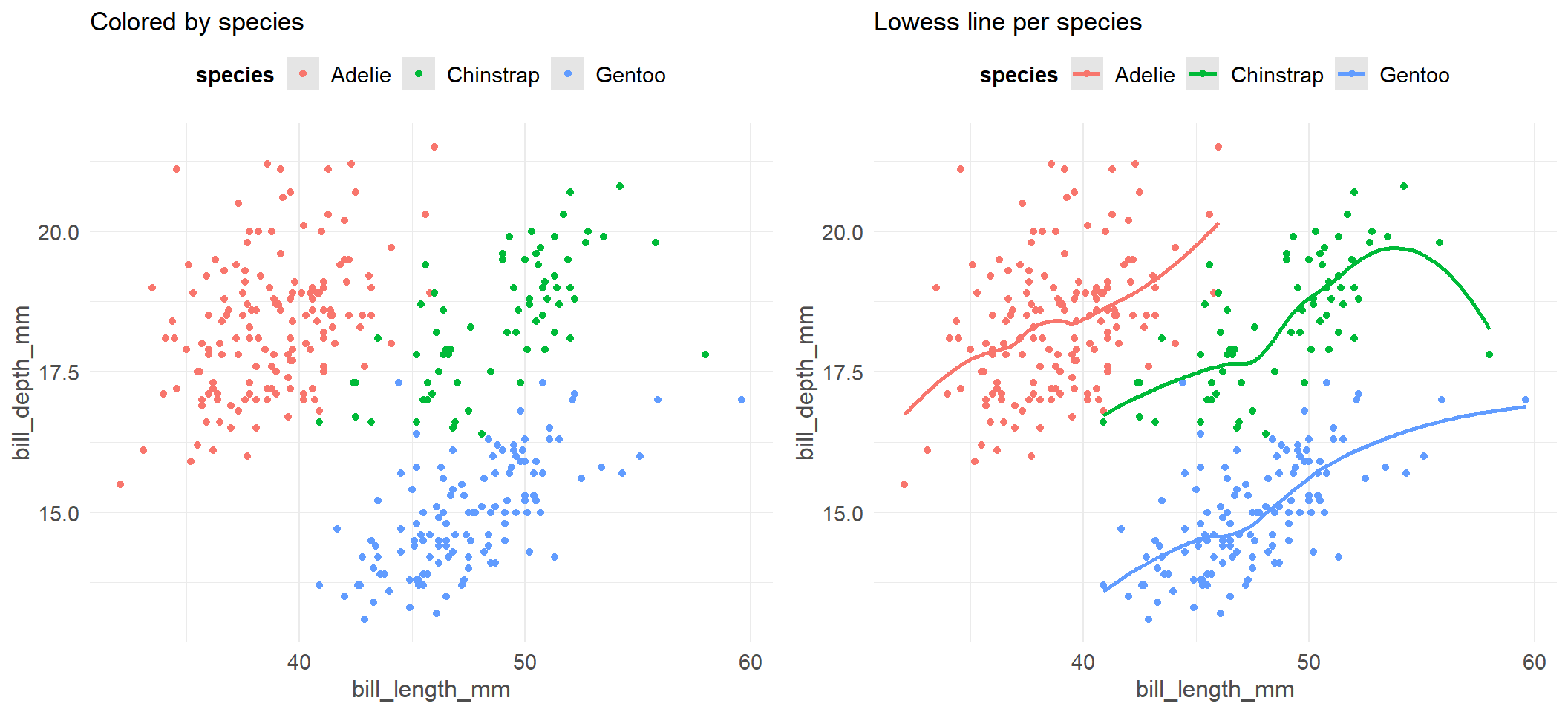 a <- ggplot(pen, aes(x=bill_length_mm, y=bill_depth_mm, color=species)) + geom_point() + ggtitle("Colored by species")