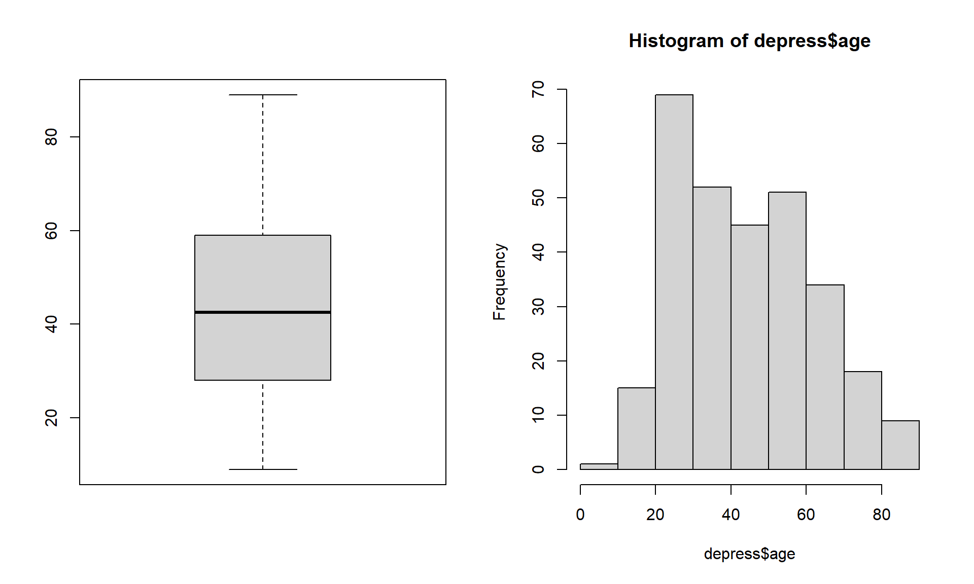 This section uses the raw depression data set from the Afifi et. al. textbook. This is a tab-delimited data set, so we opt to use read.table here. We include arguments sep="\t" to indicate columns are separated with tabs and header=TRUE to indicate the first row of the data is the variable names.